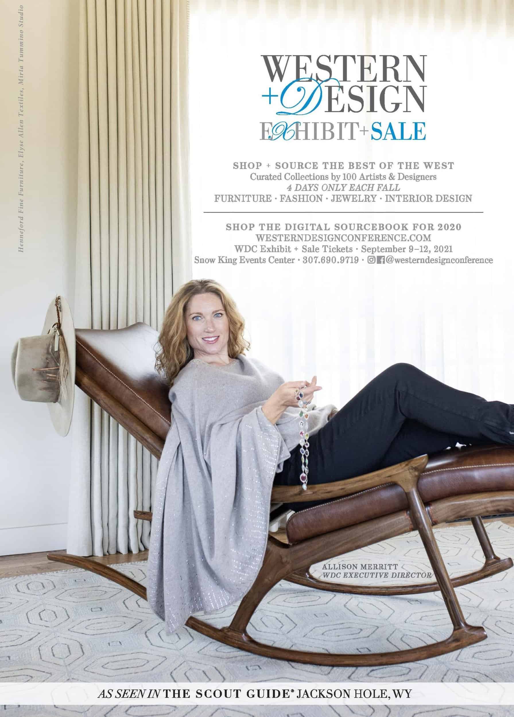 Featuring work by Western Design Conference Digital Sourcebook artists: Elyse Allen Textiles (cashmere Ruana with Swarovski Crystals in Chanterelle), Mirta Tummino Studio (Celia Technicolor gemstone necklace), Henneford Fine Furniture (Chaise Rocker).