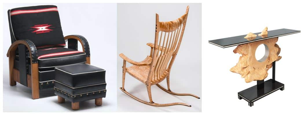 L to R: HowKola Furniture by Tim Lozier Molesworth club chair and ottoman; Sam Maloof Woodworker rocking chair; MosArt Furniture maple and gilded console table.