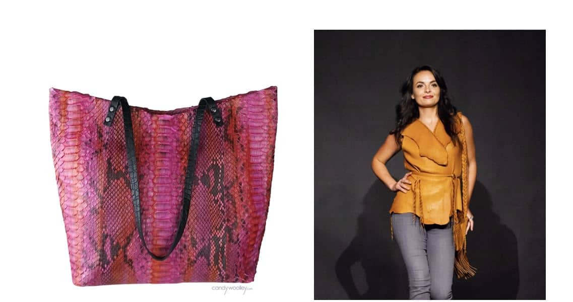 A Candy Woolley Accessories Montana fuchsia python tote and, on the WDC Fashion Show runway, Helga’s Design deerskin vest and fringe bag offer bold fashion statements.